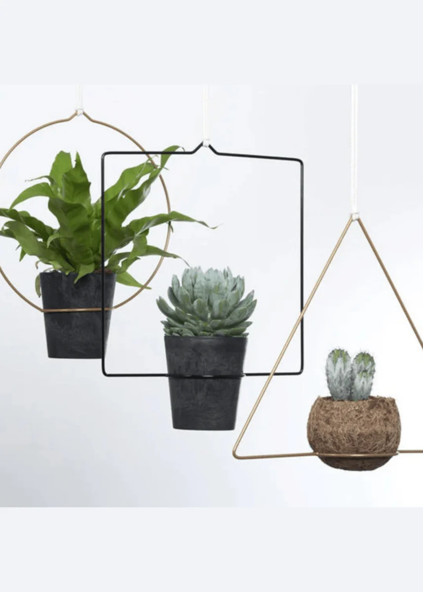 Les superbes supports de plantes de DZ peuvent être accrochés seuls ou en groupe. Ils existent sous forme de cercle, de triangle ou de carré, de couleur noire ou dorée. Que ce soit au plafond, à la fenêtre ou sur une belle barre en bois, c'est à vous et à votre créativité de décider !